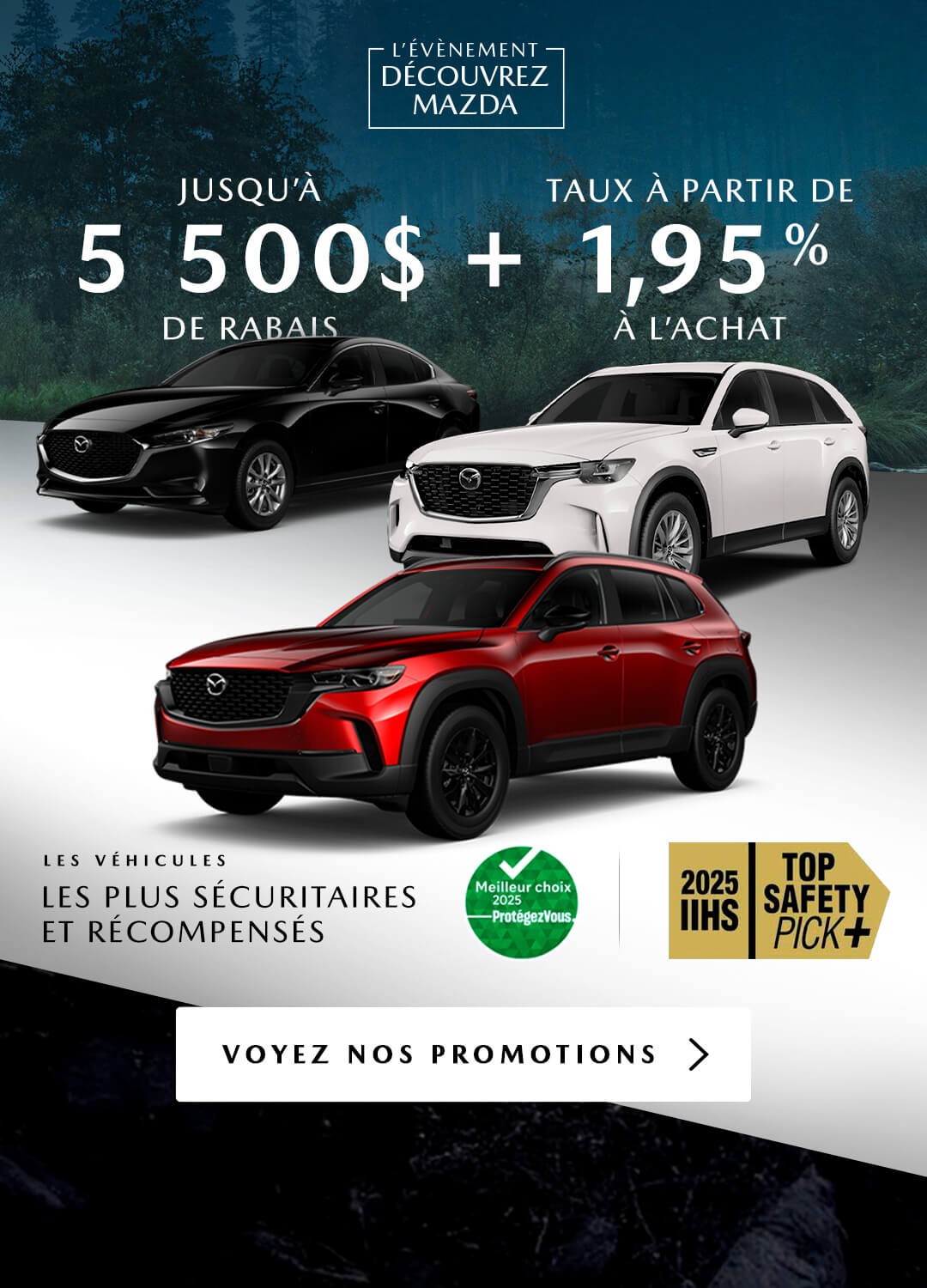Mais quel que soit le modèle de véhicule Mazda à vendre en Estrie qui vous fait de l’œil, vous pourrez profiter de nos offres de promotions en vigueur, de l’expertise de nos techniciens du département des pièces et service, et du service exceptionnel de notre équipe de conseillers du Groupe Beaucage Mazda. Nous avons à cœur de vous offrir une expérience d’achat des plus agréable, quels que soient vos besoins.